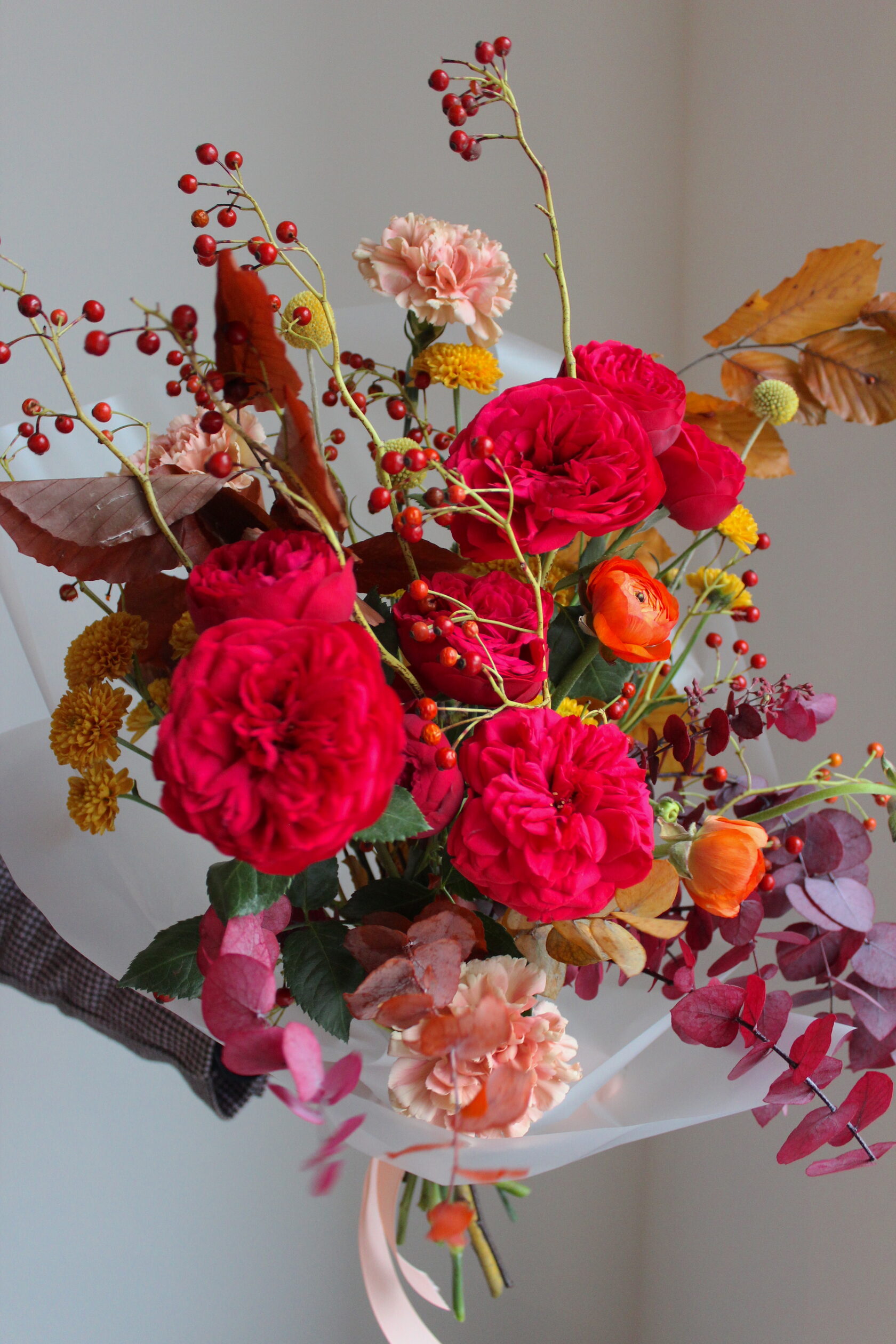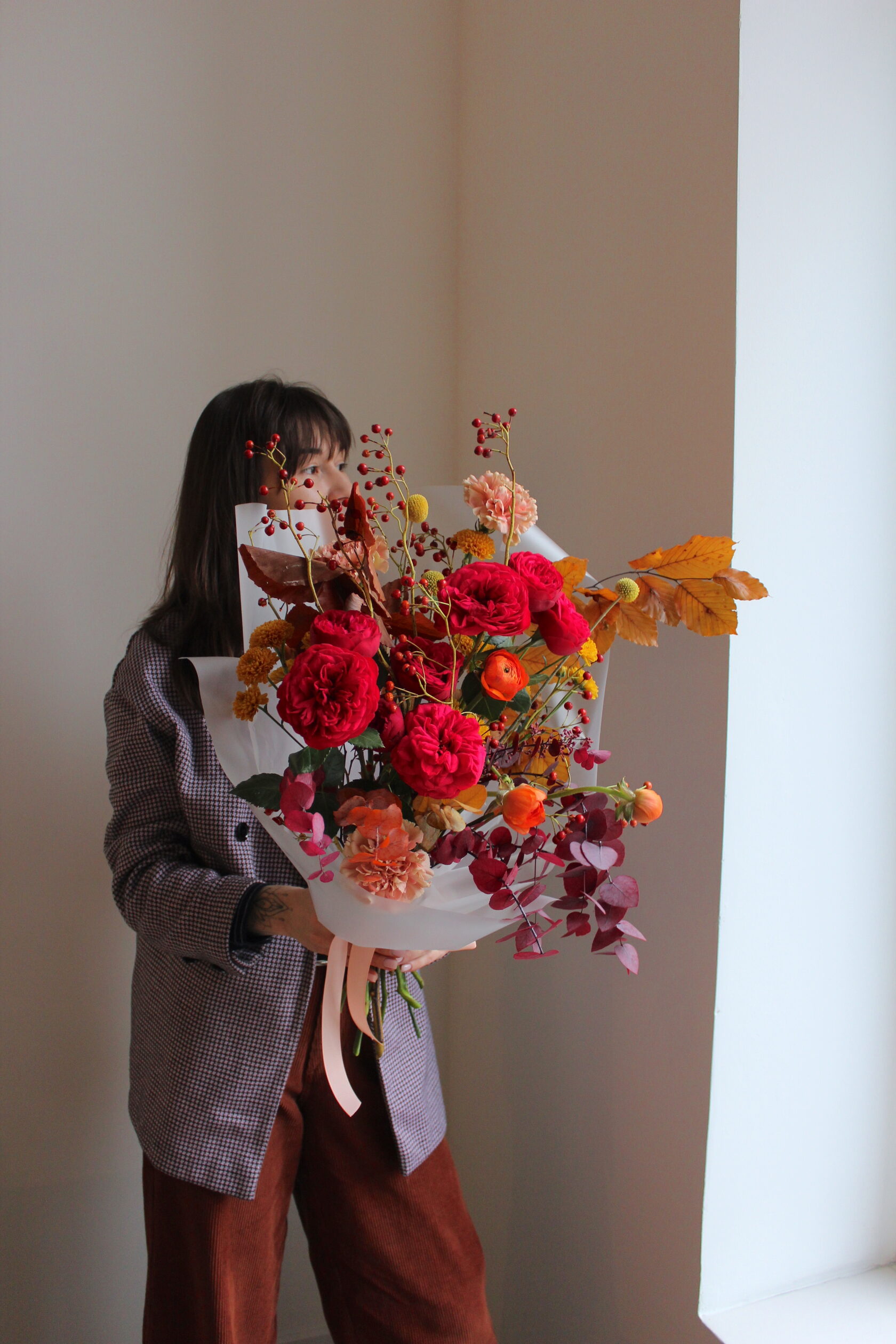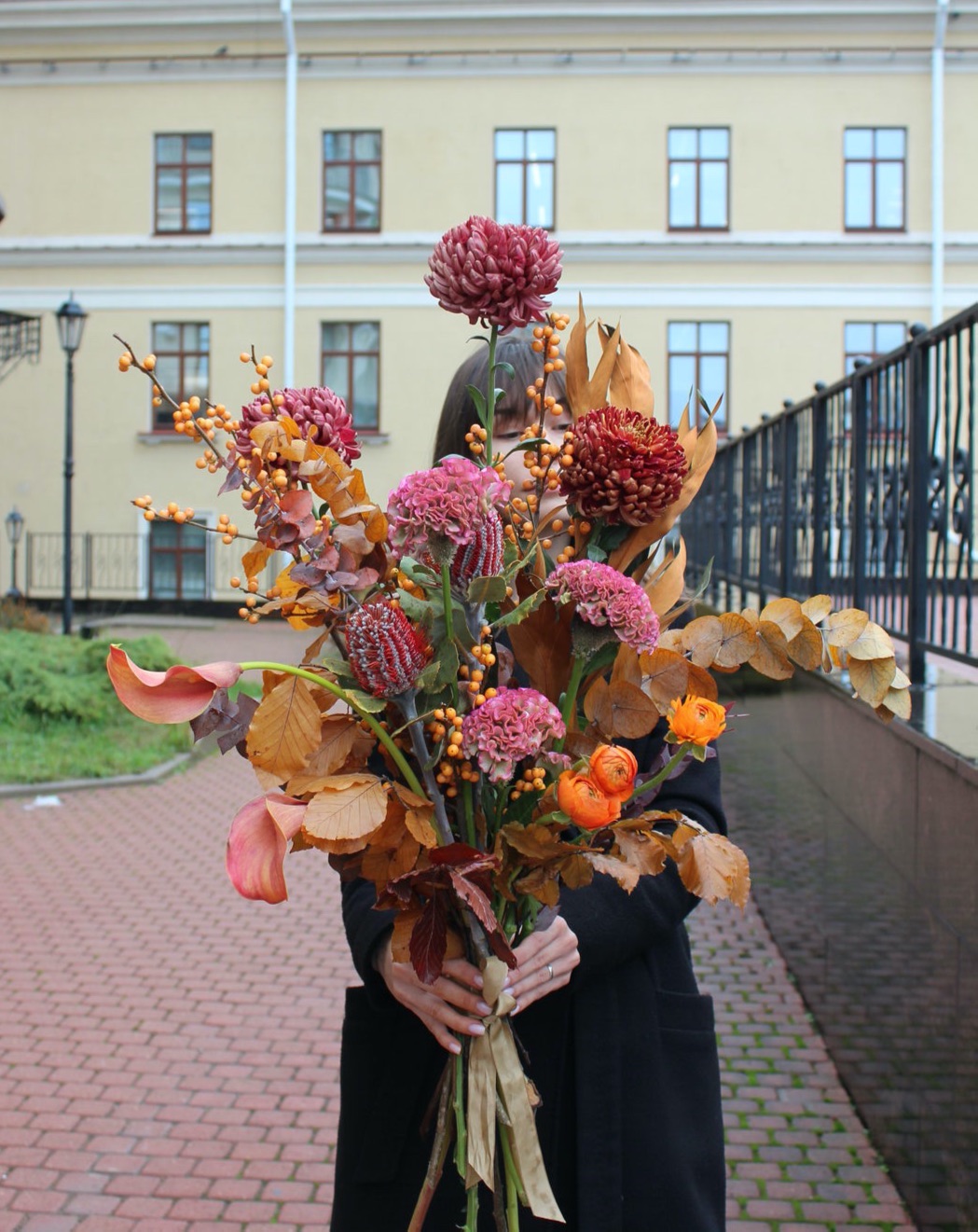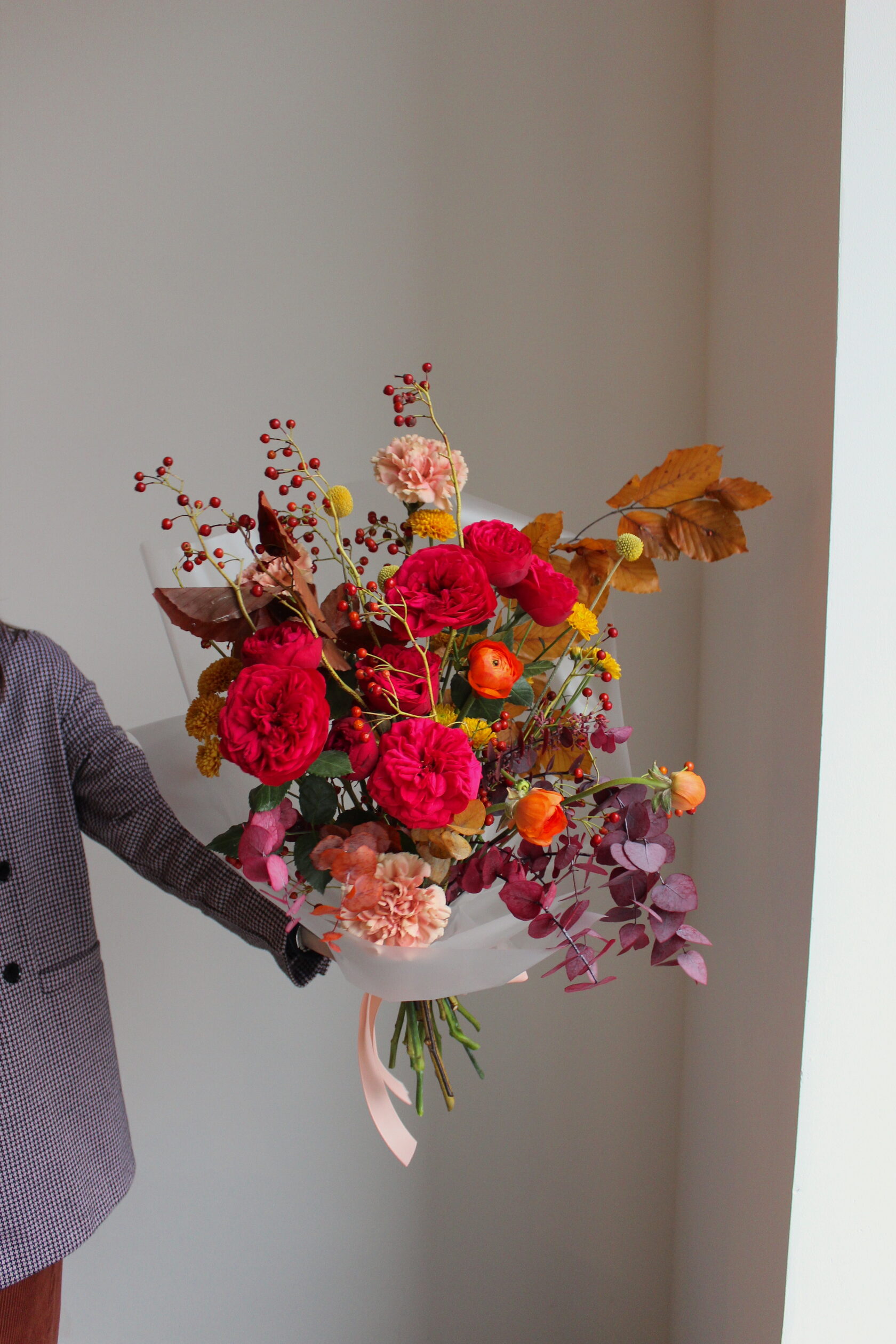 Букет в самой особенной гамме с прекрасными пионовидными розами и переливами осенних оттенков. А ягодки и листья, как напоминание о природе, которая отдает нам свои самые ценные дары. Тёплый, яркий, осенний ❤️